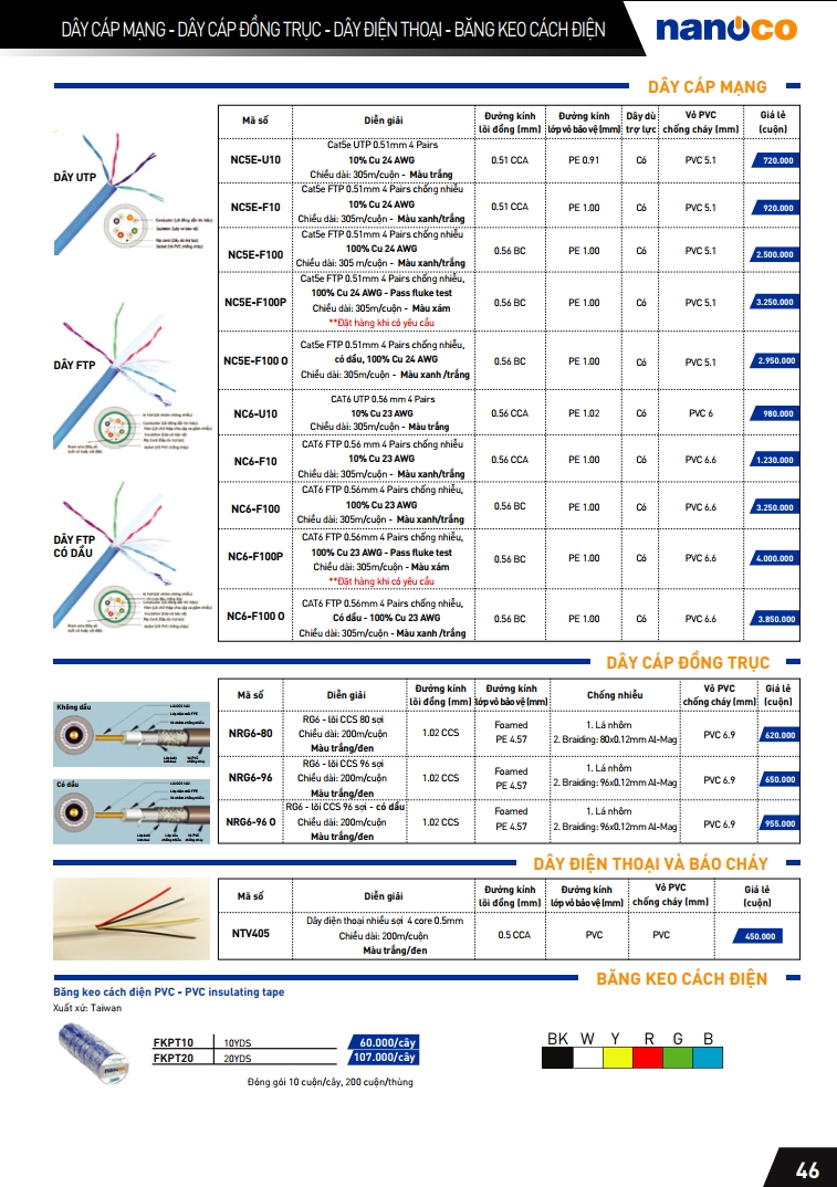 Bảng giá dây cáp mạng, dây cáp đồng trục, dây điện thoại băng keo điện Nanoco