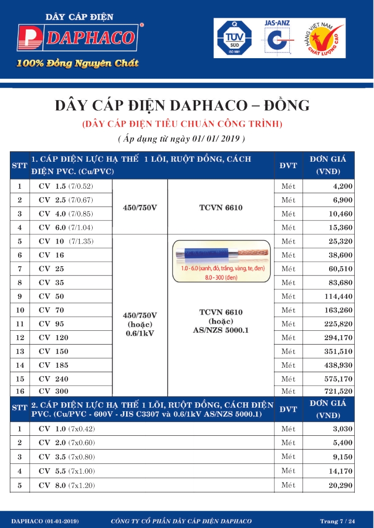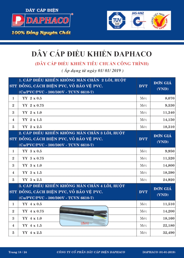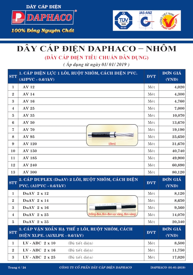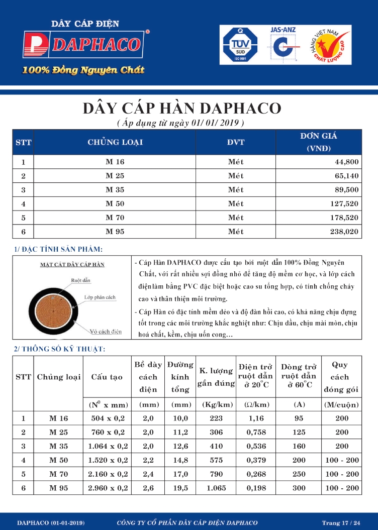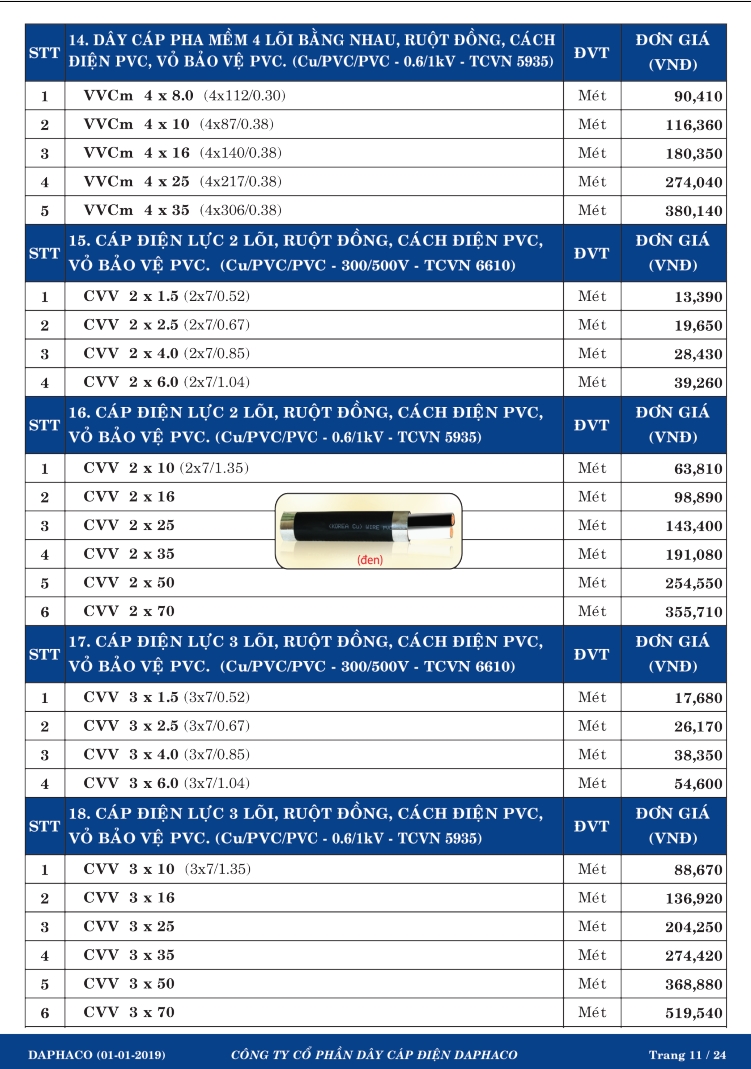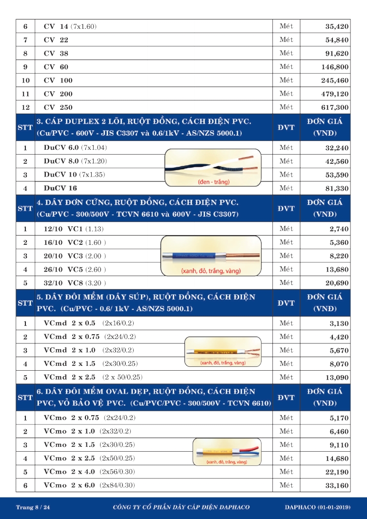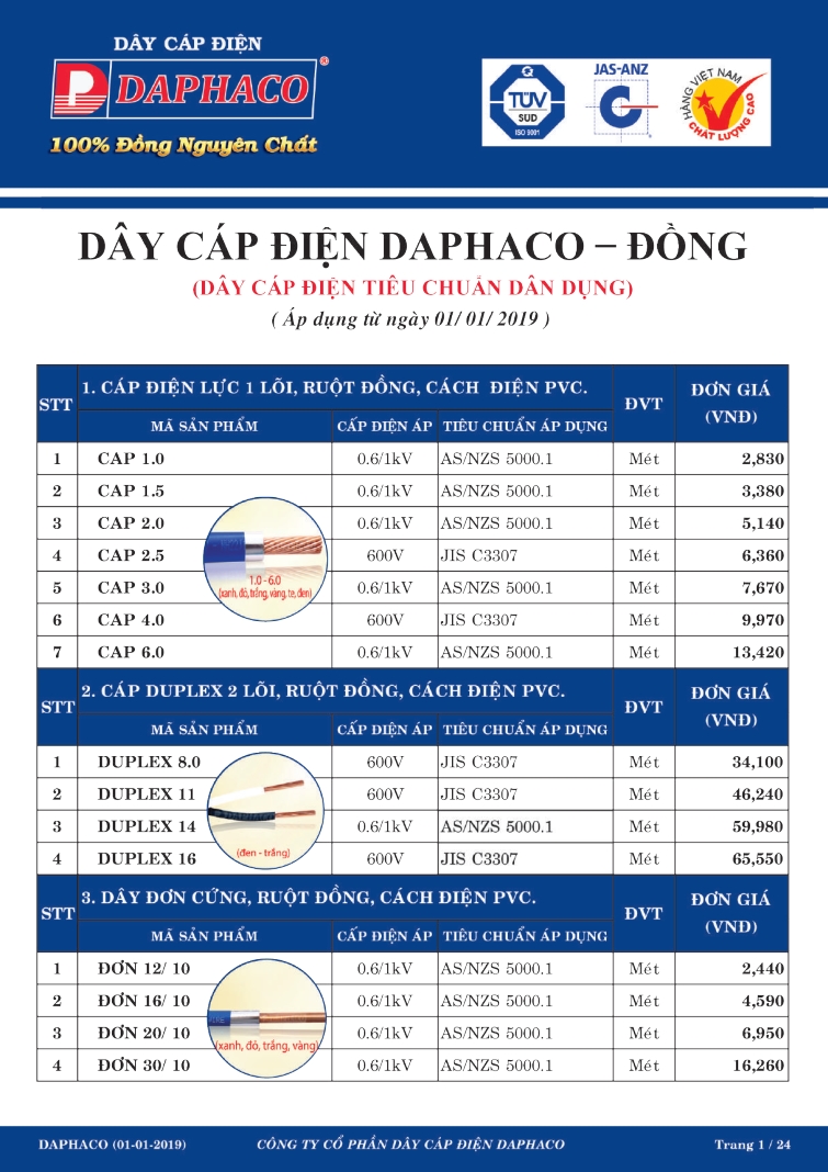 Link download bảng giá dây điện Daphaco 2019 mới nhất